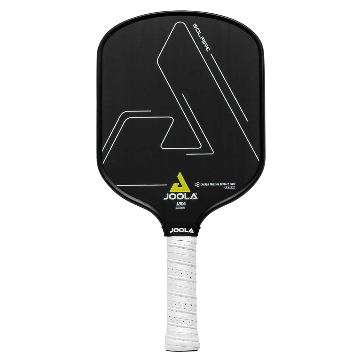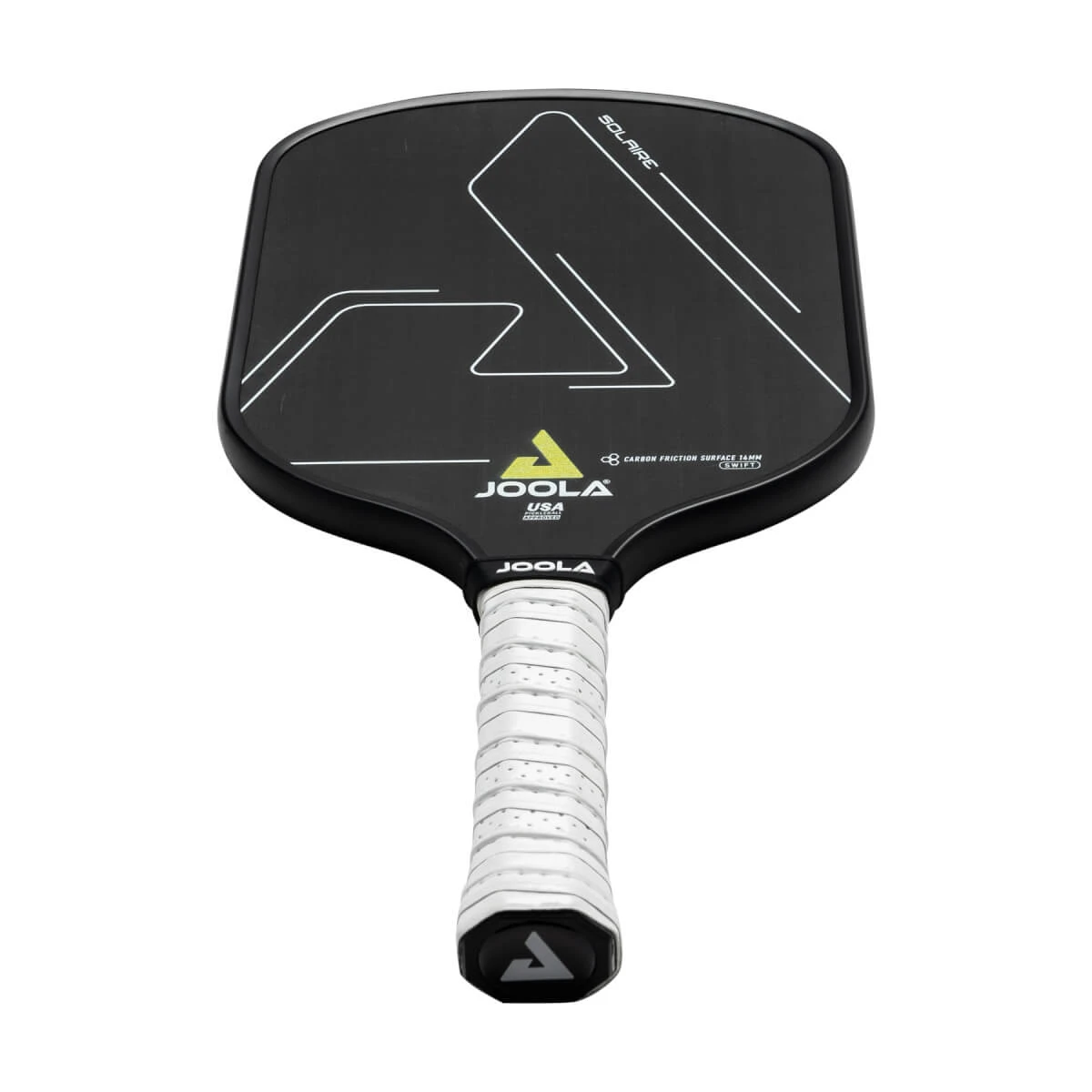 Following the trends of all court performance, pickleball paddles by JOOLA, the JOOLA Solaire CFS 14mm Swift Middleweight Carbon Fiber Pickleball Paddle is here. An aggressive paddle with a balance of control, JOOLA has designed a standard paddle for the intermediate to professional player. The face of the paddle will feature a Carbon Friction Surface (CFS)The Next Best Thing for Spin: JOOLA’s CFS technology utilizes a more advanced, durable, longer lasting Carbon-Flex5 textured surface, harnessing raw power while providing maximum spin. The CFS face packed with aREACTIVE POLYPROPYLENE HONEYCOMB CORE ADDS CONSISTENCY: Specially tuned for the high-level player to maximize the consistency of the bounce and feel necessary for every shot, with reduced vibration and 14 mm core gives players the ability to finish drives or spin to win on the court. Designed to have a larger sweet spot, gives players the ability for blocks and correcting mishits with every shot. Equipped with Hyperfoam edge wall to secure your paddle and no longer feel dead spots on the edge of your paddle. Now for the first time available in a middleweight, with a long handle and standard grip the JOOLA Solaire CFS 14mm Swift Middleweight Carbon Fiber Pickleball Paddle will be great for players of all skill levels and give comfort to any player.