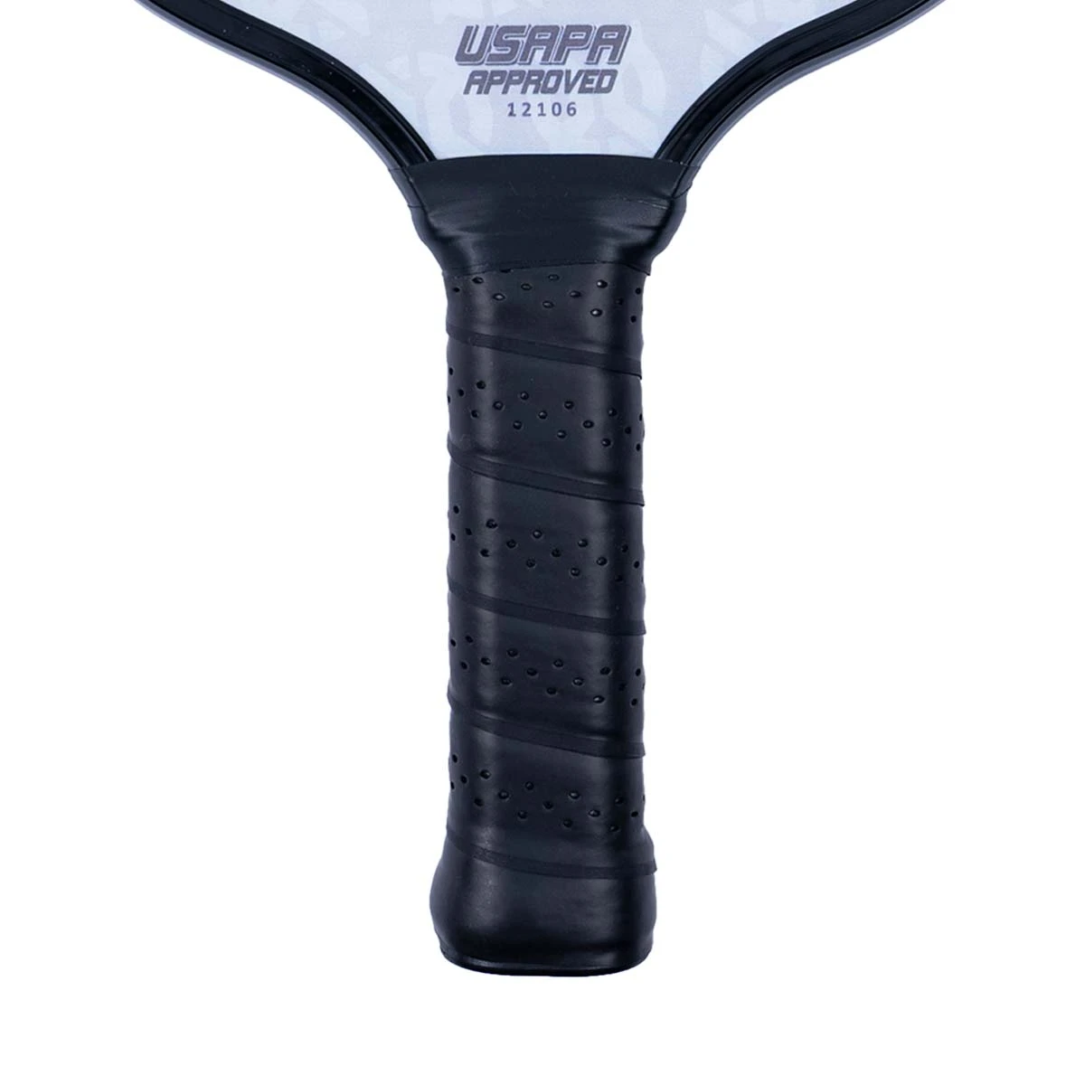 The 16″ length and 8″ width provides a paddle design that helps slightly increase the player’s reach and the overall hitting surface. You will typically find intermediate to professional players swinging the Onix Evoke Premier. The Atomic13 Edge Technology helps eliminate shock, increases a player’s power, and adds swing speed to the paddle.